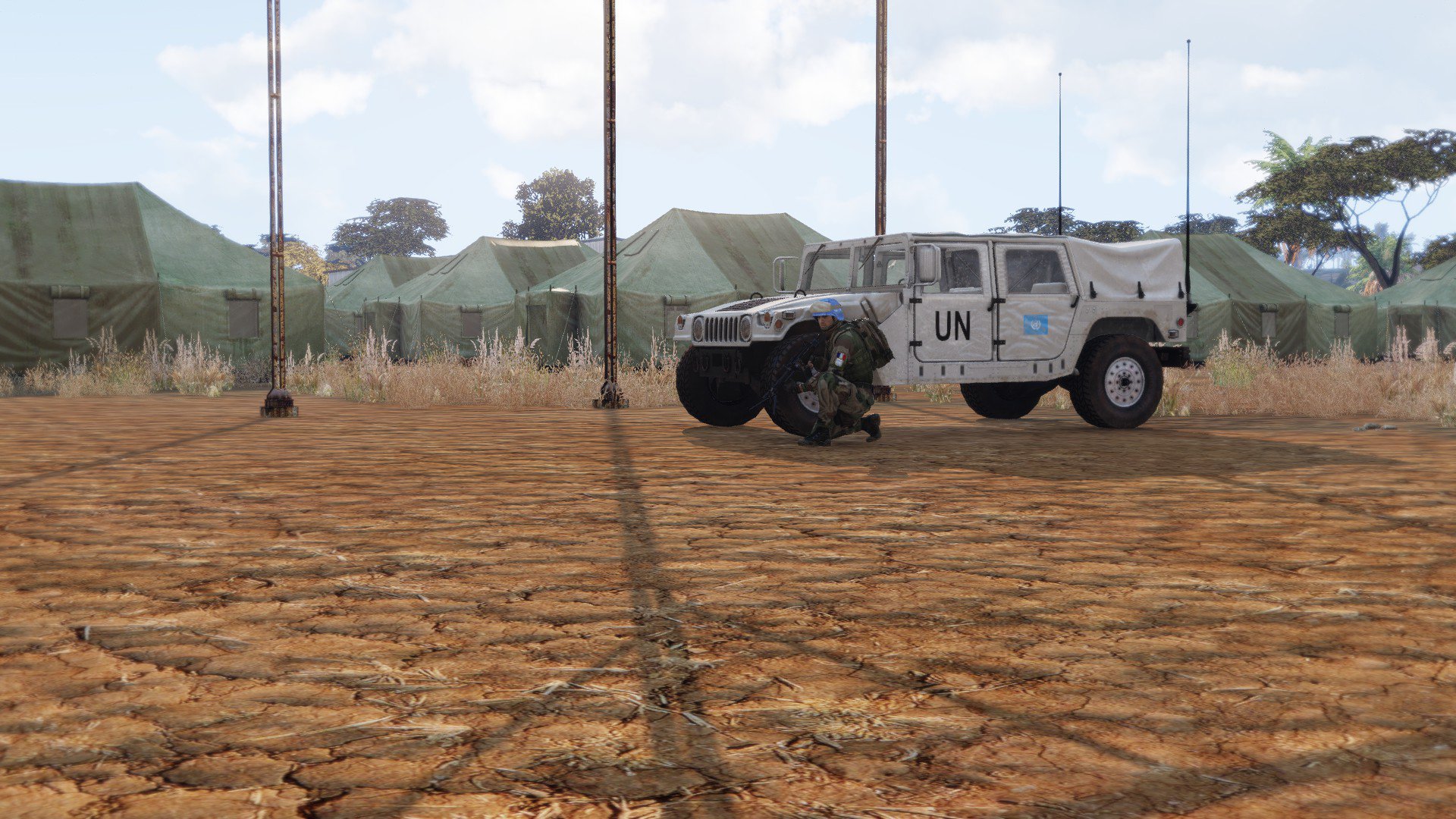 UN have deployed peacekeepers to keep the security of a refugee camp on the war-torn Isla Duala. Food, water and medicine have been shipped here by IDAP to aid the locals. The shipment contained military supplies for the UN forces too.
