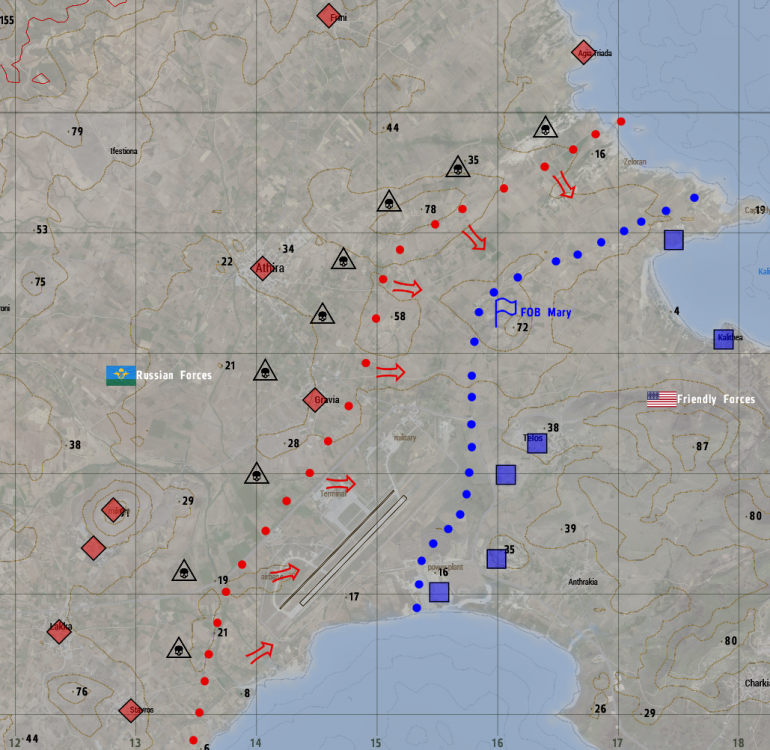 Backstory You are currently deployed within Altis as part of the 41st Infantry Company of the United States Army. For the past few months, you have been with Russian forces to bring down Altis insurgents. However, as of May 17, Russian forces are now considered hostile and forced U.S. forces to the East. Due to Russian preparation, they currently have air and naval supremacy forcing our ties to external support to be severed. Our main objective is to regain control of Altis. This will not be easy but if we manage our forces and work together, we will succeed. WESTERN SITREP MAP KEY BLUE – American Controlled RED – Russian Controlled Squares – Dominant power in control of city, town, location, etc. Dots – Represents the borders of either forces. Organization & Equipment Each Squad will be organized to contain: a Squad Leader, Grenadier (2iC), Combat Medic, an AR team, and three LAT Rifleman. Assets Ground Transport: 2x M2 HUMVEE 2x HUMVEE 1x M2 MRAP Armor: 1x Abrams Fire Support: 1x M252 Mortar Aircraft: 1x UH-60 Black Hawk 1x AH-6 Little Bird If friendly armor or aircraft are destroyed, a replacement will be provided in 3 missions. After each operation in enemy territory, all vehicles must be returned back to the starting location. If an asset is heavily damaged, you either can leave it or destroy it. Any asset abandoned within Russian controlled territory will count as a loss of the asset. Any asset left within U.S. controlled territory will be decommissioned for one mission. Any Russian equipment that is captured during an operation will be available in the future. Russian equipment will not be replaced if lost. Medical System Instant death is not enabled, advanced wounds are enabled, and respawns are only available after certain requirements. Consequences Every operation has a possibility of being larger than the original place. Command (Crossroads) will advise if there is an opportunity to go past the main objective. For example, if an assault on a town occurs and the town is captured and a Russian officer is spotted in a nearby base, Platoon can choose to ignore or deal with the officer. Each action has various possible consequences in future missions. Additionally, Platoon has the ability to abandon an operation by retreating. Reinforcements During certain occasions, friendly forces may be called to assist. If the option for friendly reinforcements is available, Platoon will be informed by Command. Be aware, if reinforcements are called, there is a cooldown depending on casualties and size of reinforcements. Missions will be added after this thread goes up. Remember, we’re what’s left defending Altis. --- PLEASE LEAVE THE THREAD CLEAR OF REPLIES SO MISSIONS WILL BE EASIER TO FOLLOW. IF YOU HAVE COMMENTS OR QUESTIONS, SEND ME A PM.