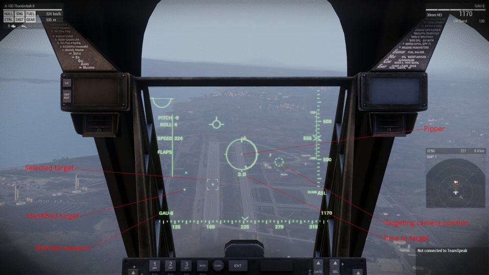 The A-10A (RHS) is quite different from the Vanilla A-164 (or A-10D with ACE). Offering a more realistic depiction of the A-10 target acquisition system, it can be confusing the those using it for the first time. This guide aims to explain why it works the way it does, and how to use it. Basically: the A-10A does not have a targeting pod. You can still pretend you have one. Using your "Targeting camera" keybind (default: LCtrl + RMB) your camera will move to the television monitor to the right of your climb and altitude indicators. If you press "N", the monitor will switch to a thermal image. This acts similar to most fixed-wing targeting pod cameras: you can move the view around (through a limited angle), zoom in and out, and lock the turret onto vehicles and terrain. This image is the direct video feed from the IIR seeker of an AGM-65D loaded on one of your pylons. Naturally, this means you won't get any video feed if you don't have at least one Maverick loaded. Now you know how the A-10A video feed works. What difference does this make to its usage? For one, this means that you won't see shit once you use your last Maverick, and that you can only get a thermal image - not NV or VIS. More importantly, it means: 1. You need to manually guide the seeker onto the target before being able to engage it. 2. You cannot cycle targets - you must use the "Lock target" keybind (default "T" but this is overwritten by TFAR. Bind it to something else or rebind the TFAR "SW transmit additional" keybind. The "Lase range" keybind may also cause issues. Figure it out). Because the "Lock target" function selects the target in the center of your screen, you need to be in the seeker view, with the seeker stabilized on the target, when you lock it. If the seeker is facing forwards, you can just lock looking through your HUD. So, the process: 1. Enter the television monitor view. (keybind: Common -> "Targeting Camera") 2. Activate the IIR seeker. (keybind: Common -> "Night Vision") 3. Slew the seeker head onto a target and stabilize it. (keybind: Weapons -> "Stabilize Turret") 4. Lock the weapon onto the target. (keybind: Weapons -> "Lock Target") 5. Maneuver into position and fire. You can also slew the IIR seeker without entering its view. You need to bind your User Action 15 - 18 keys for this (found under "Custom Controls"). On the A-10A HUD, there is a cross showing the position of the Maverick's IIR seeker view. If you have visual on a target from your cockpit, you can use the user actions to slew the seeker head onto the target without entering the TV monitor view. User action 15: Left. User action 16: Right. User action 17: Up. User action 18: Down. http://www.rhsmods.org/w/a10a