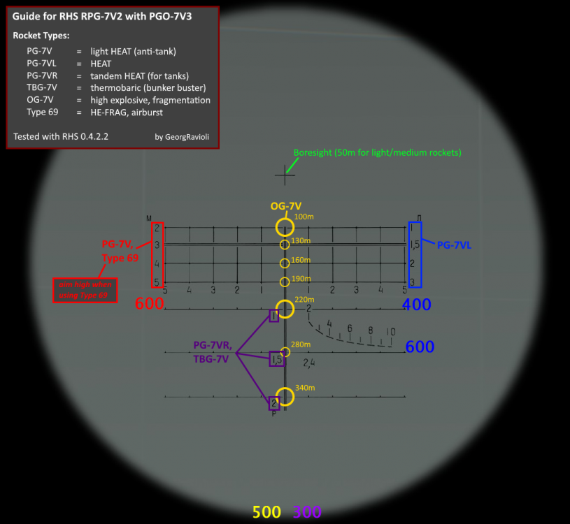 This guide is out-of-date and explains stuff related to the pre-November 2019 Modpack, as such take what is discussed here with a grain of salt Nick's portable AT/AA and target aquisition guide So, I know i'm not the first to do a guide like this but the others seemed kind of lackluster in terms of details and were not updated since like 6 months, so here is my take on it. If you spot a discrepency or just a missing info, you can put it in the replies of this thread. Table of content Abbreviations and differences Tips Launchers ERA Cage armor Abbreviations and differences Launcher types LAT or Light Anti-Tank is a single shot launch system designed to be carried by infantry. Exemples include the M136 or the RPG-26 launchers. MAT or Medium Anti-Tank is a multiple shot launch system designed to be carried by infantry. Exemples include the MK153 Mod 0 SMAW or the M3 MAAWS launchers. HAT or Heavy anti-tank is a multiple shot launch system designed to be carried by infantry. By our ruleset, anything that can lock-on ground vehicles enters this category. Exemples include the FGM-148 Javelin and the Titan MPRL compact. Rocket or Missile? A rocket is an unguided rocket-propelled projectile while a missile is a rocket-propelled projectile with some form of guidance Ammo definitions HE: High-Explosive HEAT: High-Explosive Anti-Tank HEDP: High-Explosive Dual-Purpose HEAA: High-Explosive Anti-Armor AA: Anti-Air AT: Anti-Tank HP: High-Penetration FRAG: Fragmentation Tandem: Projectile with 2 warheads used to defeat protection such as ERA and cage armor Thermobaric: Very high temperature explosion (Bunker-buster) Airburst: FRAG that explodes in the air, usefull against entrenched units HEATRAP: Short for High-Explosive-Anti-Tank-Rocket-Assisted-Projectile (big bullet) Misc tips and tricks If your launcher has an overfly top attack mode, you should always use it as it's more effective in general. Only exception is if you're too close to target or the sky is obstructed by a building. KEEP CLEAR OF WALLS! If you fire too close to a wall or the ground you may end up injuring or knocking yourself out (Note that there are exceptions, certain launchers can be fired next to walls as they are launched from the tube before the rocket itself ignites) Same goes with allies, they may not appreciate getting knocked out because you forgot to ask people to clear backblast Firing a rocket during a night mission is like lighting a flare, ensure you are able to move to a new position after firing Wireguidance is not a toy, if you miss, crash your missile. Certain launchers point downwards on your back and if the missile is able to, it will boomrang back to you, not an honorable death no? When your squad has MAT, don't forget who has your ammo because no, you won't be able to carry all of it yourself When you are part of the MAT team, you are as important as the medic, if you die, your squad will be left with no AT capabilities so don't take unessecery risks As of the latest RHS update, single shot launchers have trouble with precision at greater distances to simulate how it is IRL. The range depends on the launcher but a rule of thumb is of around 200-300m before it loses accuracy Portable AT/AA launchers NLAW In vanilla Arma this weapon seems like nothing special, but with Ace 3 it changes how the weapon performs. The NLAW is a 115mm AT single-use, fire-and-forget missile launcher. It has nightvision and a rangefinder. The missile it fires can adjust it's flight patern to compensate for gravity meaning that there is no so called "bullet drop". It can also be fired at moving targets by holding the NLAW target track key in the ace weapon controls, hold the key for 3 or more seconds while aiming at the moving vehicle and fire. If the target keeps it's speed and direction the missile will hit, otherwise it will be a miss, so it is reccomended to fire at tragets following an obvious path. Finally the launcher also features an overfly top attack mode that can be triggered by using the cycle fire mode key located in the ace keybinds. To make an overfly top attack, cycle the fire mode once and repeat the previous steps as if it was a regular attack. Note that on a stationnary target you will have to track it for 3 seconds anyway for a overfly top attack, else the missile just overshoots the target. https://en.wikipedia.org/wiki/MBT_LAW The NLAW tracking system NLAW (BAF) The BAF NLAW is the same in term of caliber and functions as the one described above but is still a bit different. It lacks nightvision, deals more damage and is around 1/2 the weight of the regular NLAW. RPG-32 The RPG-32 is a reusable 105mm rocket launcher that comes with AT and HE options for the rockets. It has nightvision and a very easy to use range table. https://en.wikipedia.org/wiki/RPG-32 Titan MPRL The Titan MPRL is a 127mm AA missile launcher. It is a reusable launcher equiped with thermalvision, an optical zoom and a rangefinder. Use your vanilla lock target key to lock on an ennemy aircraft and wait until you hear a very fast beeping or the diamond on target has a dot inside. Launchers of this type are most efficient against helicopters and planes showing their rear to you, shooting at a plane frontaly or while it's showing it's side will have a high probability of the missile missing, be aware! Titan MPRL Compact The Titan MPRL Compact is a 127mm reusable missile launcher capable of launching both AT and Anti-personel (AP) missiles. It has thermalvision and an optical zoom. Due to it being shorter compared to the regular Titan MPRL, it's only able to shoot ground targets. But don't let that fool you, it becomes a real threat to even the most hidden of vehicles! The fact is, this launcher is able to lock on targets while in thermalvision mode while holding the lock target key in the ace weapon controls. Note that this only applies to the AT missile. To lock on, all you have to do is hold the key described above on a thermal signature (yes you can